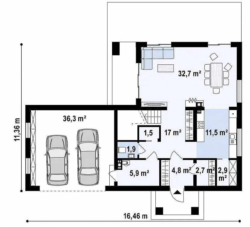 В данном варианте гараж имеет внутреннее сообщение с жилой частью дома. Отделяет его небольшое техническое помещение, выполняющее функцию котельной. Такой проект двухэтажного дома с гаражом на 2 машины универсален. Автомобильное помещение имеет оптимальные параметры, в нем есть окна для дневного освещения. Внутренний вход ведет через котельную в прихожую, где расположена компактная кладовая. Это очень удобно при разгрузке закупленных для семьи продуктов.