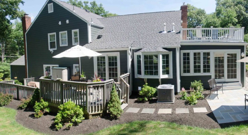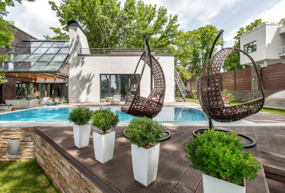 Выход лучше организовать из столовой или гостиной. Не стоит объединять террасу со спальнями. Открытая площадка располагается с противоположной стороны от основного входа. Владельцам маленьких участков нужно организовать живую изгородь или другое декорирование. Это поможет спрятать свою жизнь от посторонних глаз соседей.