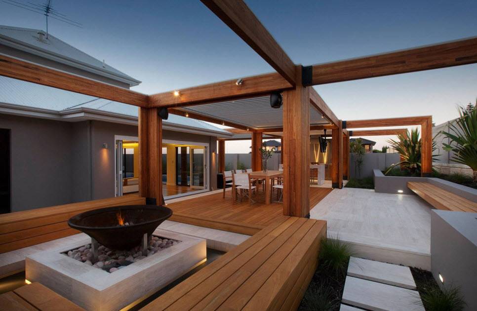В Интернете можно отыскать самые разные дизайнерские решения, однако чаще всего терраса пристраивается со стороны кухни или гостиной. Это, прежде всего, объясняется комфортностью и практичностью. В 9 случаев из 10 терраса находится с противоположной главному входу стороны. Это классический вариант обустройства одноэтажных домов, находящихся в южных областях.