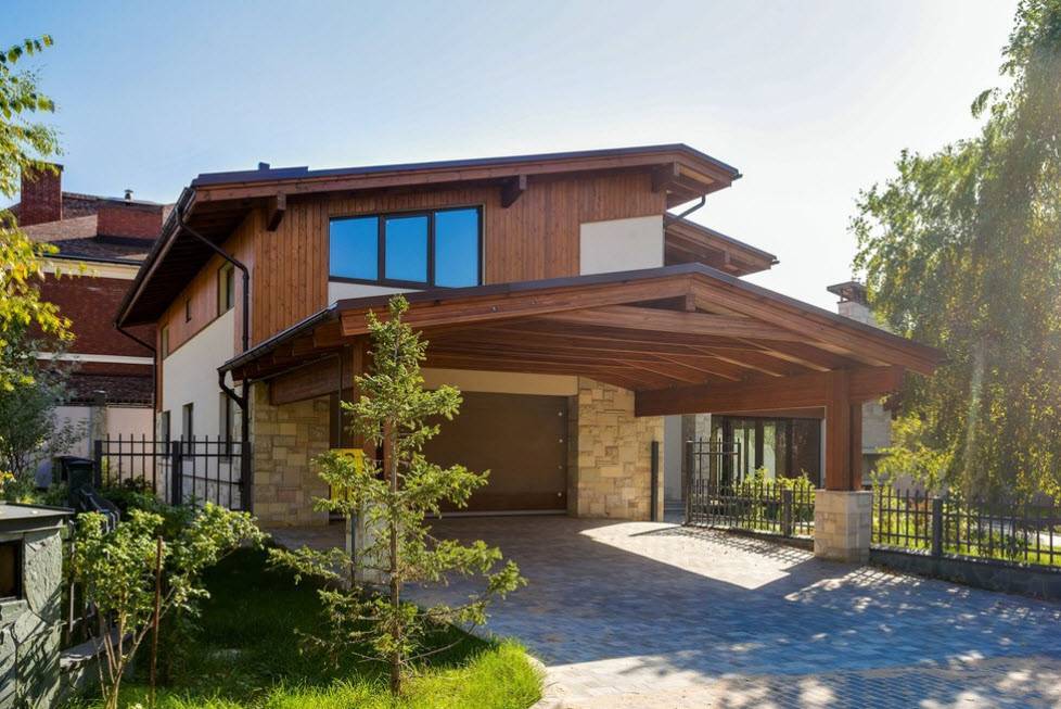 Некоторые домовладельцы предпочитают иметь пристроенную крытую парковку без внутреннего входа в дом. В этом случае снижается риск попадания неприятных запахов в комнаты и экономится пространство дома. Вход планируется с улицы, обычно под одним козырьком с основным крыльцом дома.