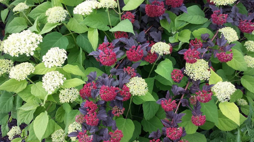 Гармонично выглядит сочетание пузыреплодника Диаболо и гортензии Аннабель