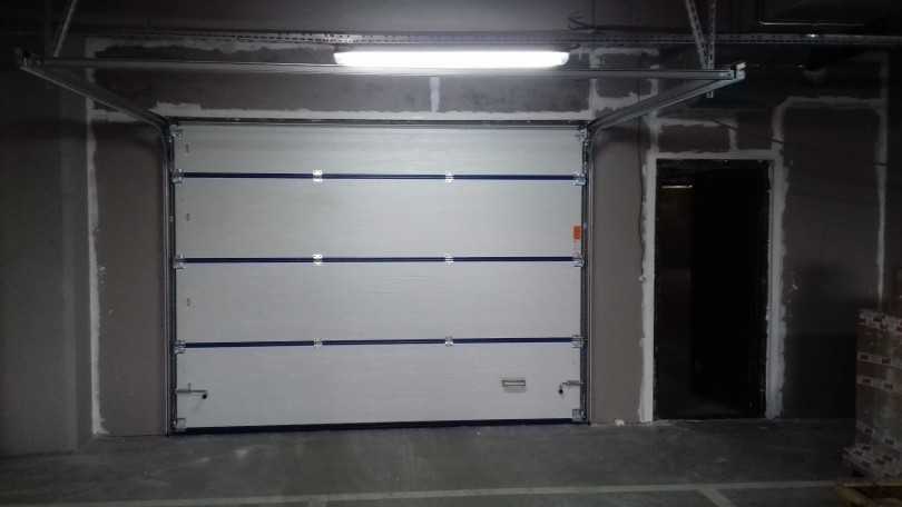 Это конструкция из нескольких секций, расположенных горизонтально и соединенных между собой специальными петлями. С помощью подъемного механизма, находящегося на потолке, ворота поднимаются по направляющим профилям и располагаются горизонтально вдоль потолка. Секции в основном изготавливают из сэндвич-панелей.