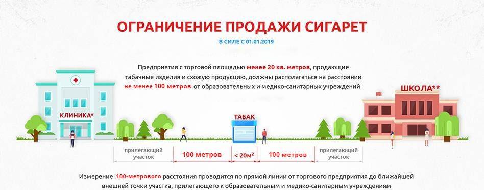 - Табак разрешено продавать на дистанции в 100 м от школьных ворот или садика. При покупке нужно предъявлять паспорт.
