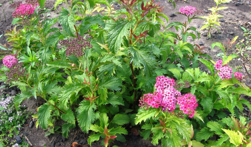 Спирея Бумальда – гибридное дитя спиреи японской и белоцветковой. Прямостоячие ребристые побеги достигают 80 см в высоту. Окраска цветков — от нежно-розового до темно-гвоздичного цвета. Период цветения – все лето.