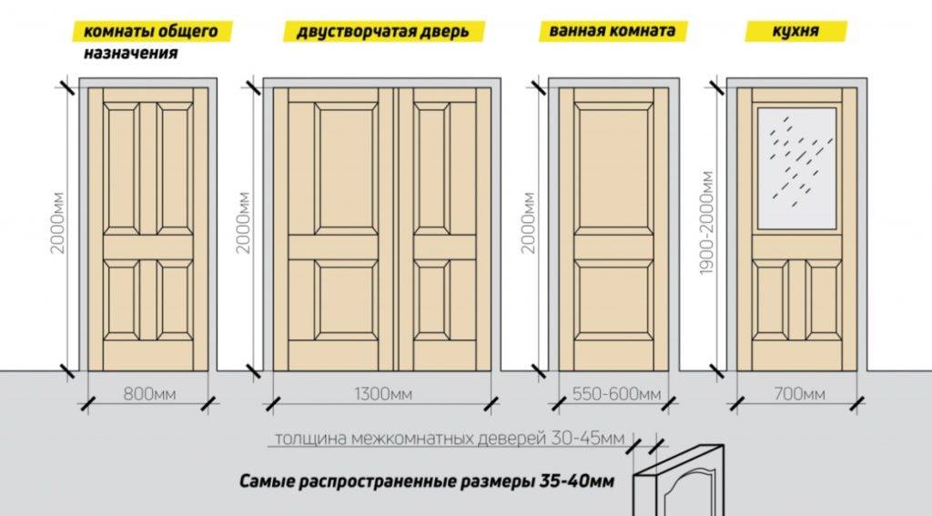 Существуют общепринятые параметры, которые применяются практически ко всем моделям межкомнатных дверных конструкций. Так, ширина современных изделий может составлять 55-90 см.
