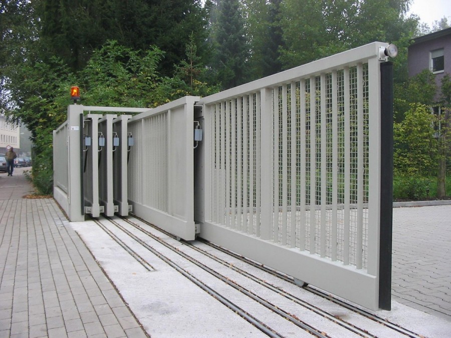 Рельсовые ворота приводятся в движение с помощью специального механизма. Такая конструкция не мешает движению авто. Она устойчива к взлому, ветровым нагрузкам, может использоваться для проемов до 6 метров.