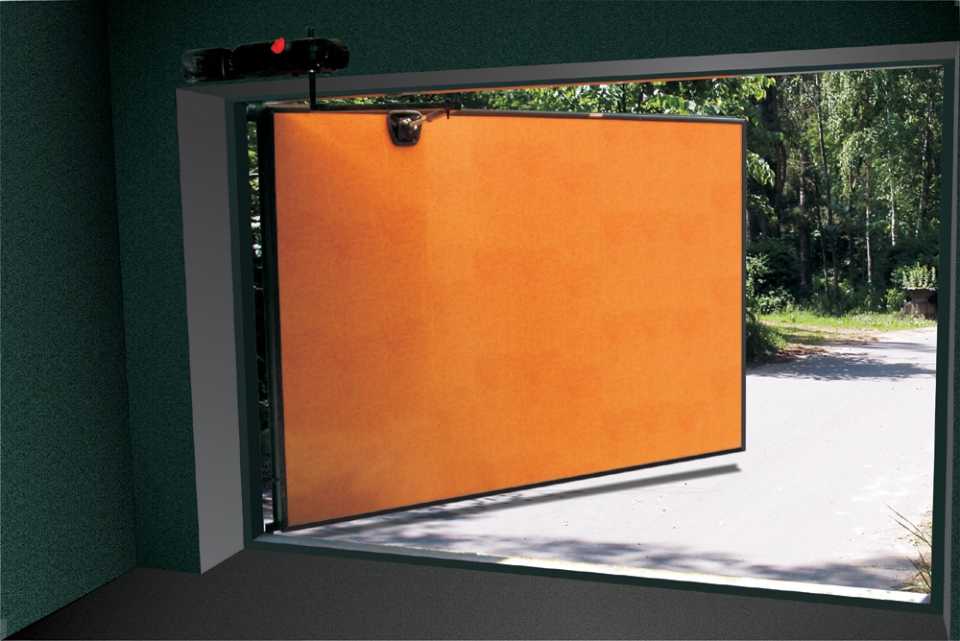Подъёмно-поворотный тип включает в себя стальной щит, закреплённый на каркасе. Обычно владельцы оборудуют такие ворота электроприводом с дистанционным управлением так, чтобы можно было открыть гараж из кабины автомобиля. Поднятая дверь размещается под потолком параллельно полу, не занимая пространства гаражного помещения.