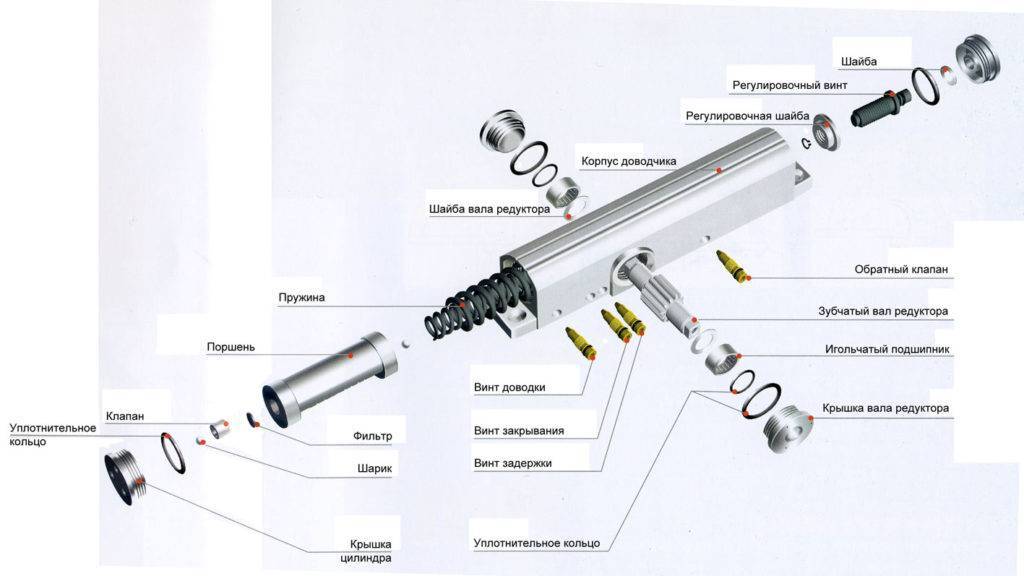 Основной рабочей деталью прибора является пружина. Она должна быть высокопрочной. Располагается в цилиндре и сжимается поршнем при открывании двери. Когда створку оставляют в покое, энергия пружины высвобождается и возвращает ее в исходное положение. То есть закрывает дверь.