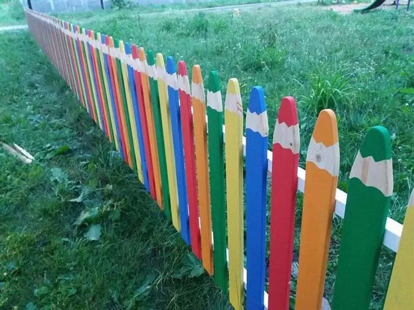 Ограду с заостренным верхом превращают в яркие карандаши. Штакетины покрывают разноцветной краской. Оригинально смотрится градиентный (постепенный) переход от одного тона к другому. Пестрота меняющихся оттенков не должна раздражать владельцев участка, поэтому дизайнеры не рекомендуют брать «кислотные» варианты.