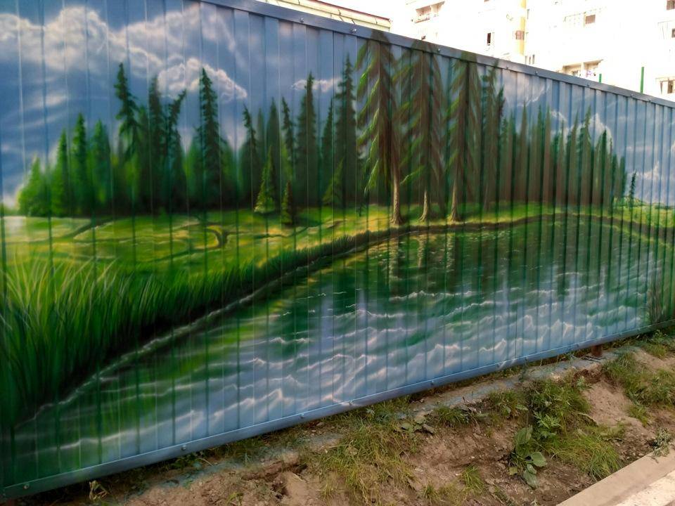Пример аэрографического рисунка на заборе Для такого аэрографа не станет помехой любая неровность на ограждении дачи. Дело в том, что при окрашивании таким способом можно силой давления на распылитель регулировать насыщенность оттенков. Картины, нарисованные аэрографом, всегда имеют объем и выглядят достаточно реалистично. Однако, для человека, не владеющего способностью рисовать, такая методика будет недоступна. Лучше всего воспользоваться услугами профессионалов.