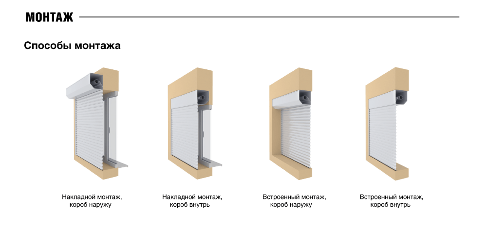 Накладной монтаж Короб роллеты устанавливается на стену фасада, обеспечивая максимальное использование светового проема. Встроенный монтаж Короб роллеты устанавливается внутри проема, за счет чего на фасаде отсутствуют выступающие элементы. Комбинированный монтаж коробом наружу Короб располагается в нише над проемом, обеспечивая максимальное светопропускание и отсутствие выступающих элементов на фасаде. Комбинированный монтаж коробом внутрь Короб роллеты располагается в нише проема передней частью внутрь. При таком монтаже опущенная роллета сливается с фасадом, так как находится с ним на одном уровне.