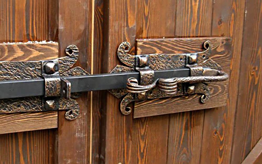 На прозрачные калитки (из штакетника или металлических прутьев) делают красивую щеколду своими руками из металлической ковки, ловко маскируя за переплетением завитушек открывающий механизм или шнур.