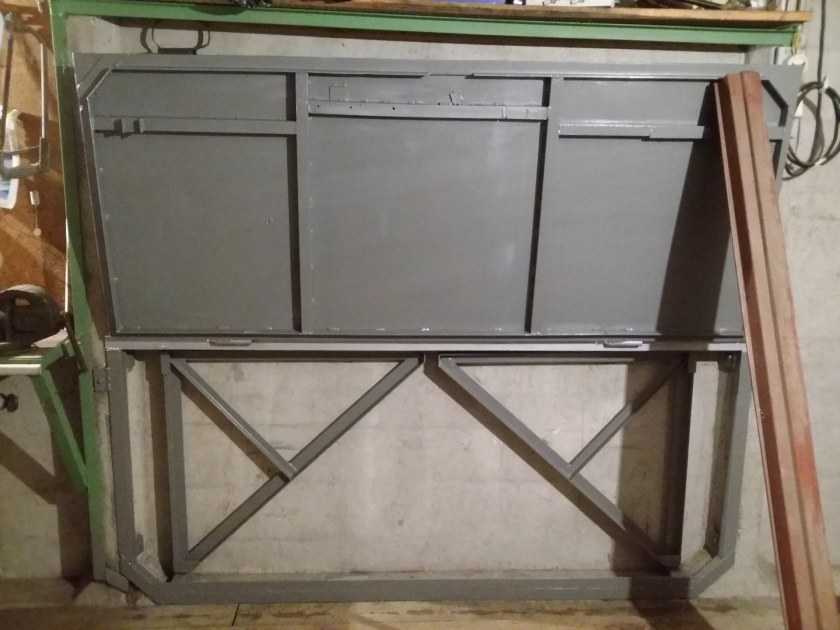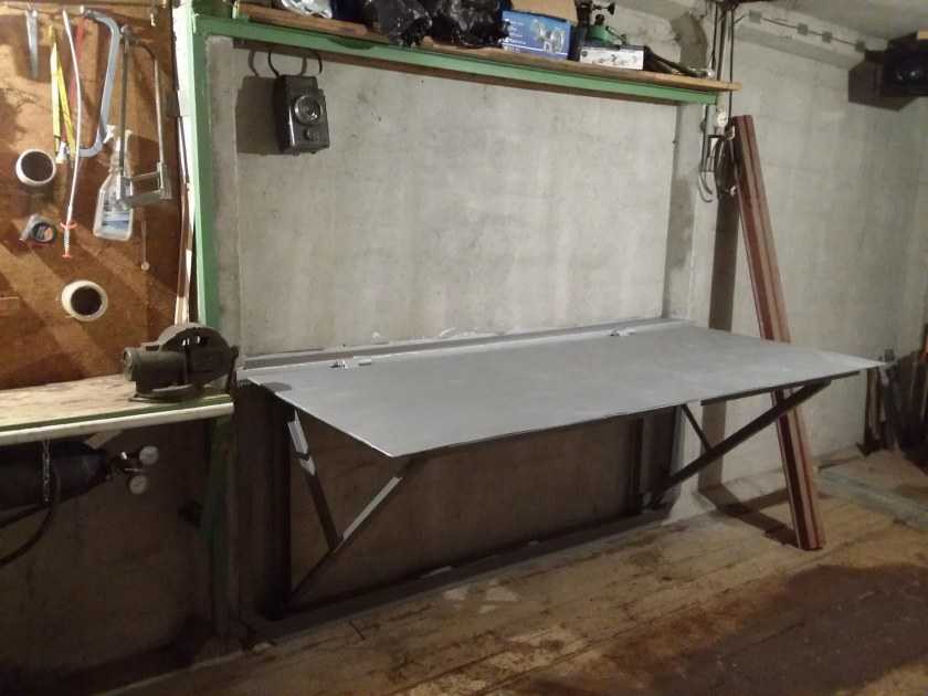 Отличный вариант самоделки своими руками в гараж – стол со складывающейся столешницей. Лучше всего делать столешницу навесной конфигурации. Это идеальное решение для компактного помещения. Стол можно использовать в качестве рабочего места.