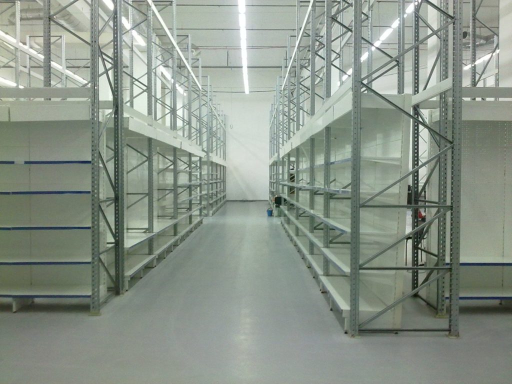 - Средний и тяжелый – для хранения более массивных предметов (в том числе продуктов питания, инструмента, промышленного оборудования, бытовой техники). Такие стеллажи встречаются в цехах, на складах, магазинах, станциях автосервиса.