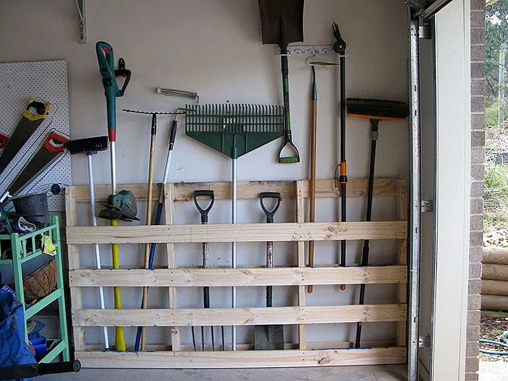 На Hometalk предлагается другой способ хранения и организации больших садовых инструментов. На этот раз деревянные поддоны были использованы для создания системы хранения для них. Проект прост, и все, что вам нужно, – это поддон, который вы можете посыпать песком и нарисовать или настроить, как хотите.