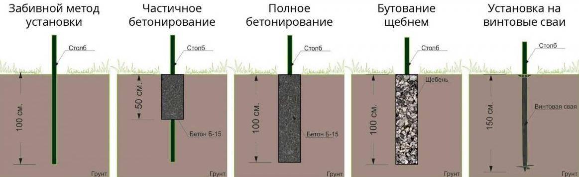 Выбор конкретного варианта заделки столба зависит, насколько влажен и плотен грунт. Например, когда грунт тяжёлый и глинистый, то достаточно выкопать ямы, поместить в них стальные трубы и залить бетонным раствором.