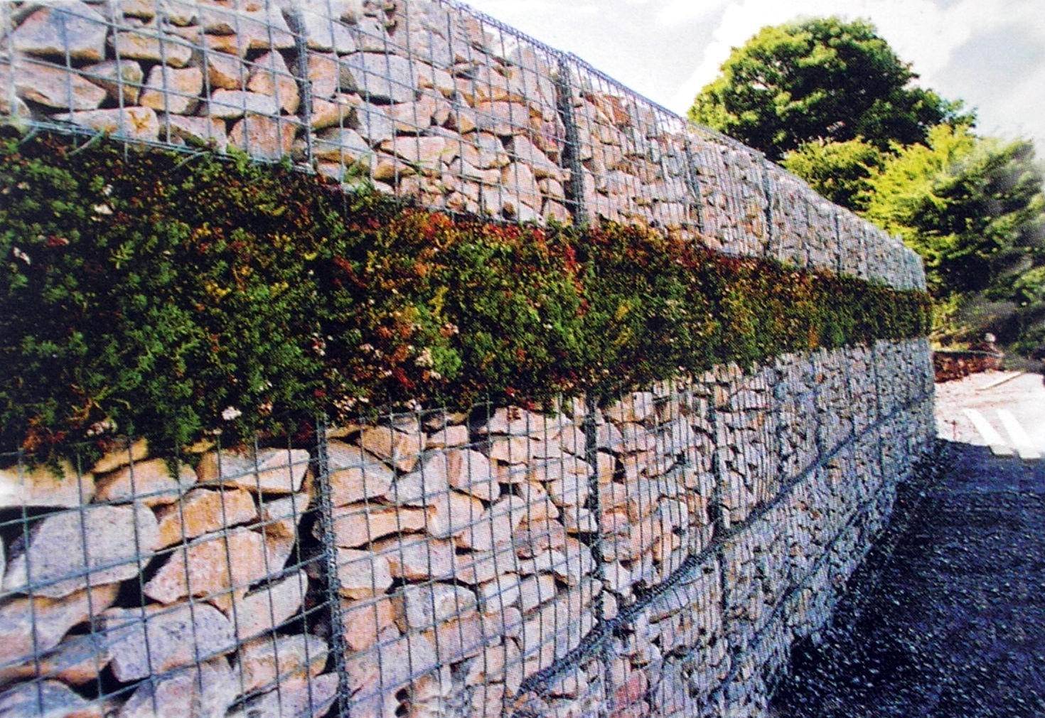 Металлические секции, наполненные булыжником, галькой, строительными отходами, щебнем, углем, стеклом или другими подходящими материалами. Готовые модули укладываются на раствор на предварительно залитый ленточный фундамент.