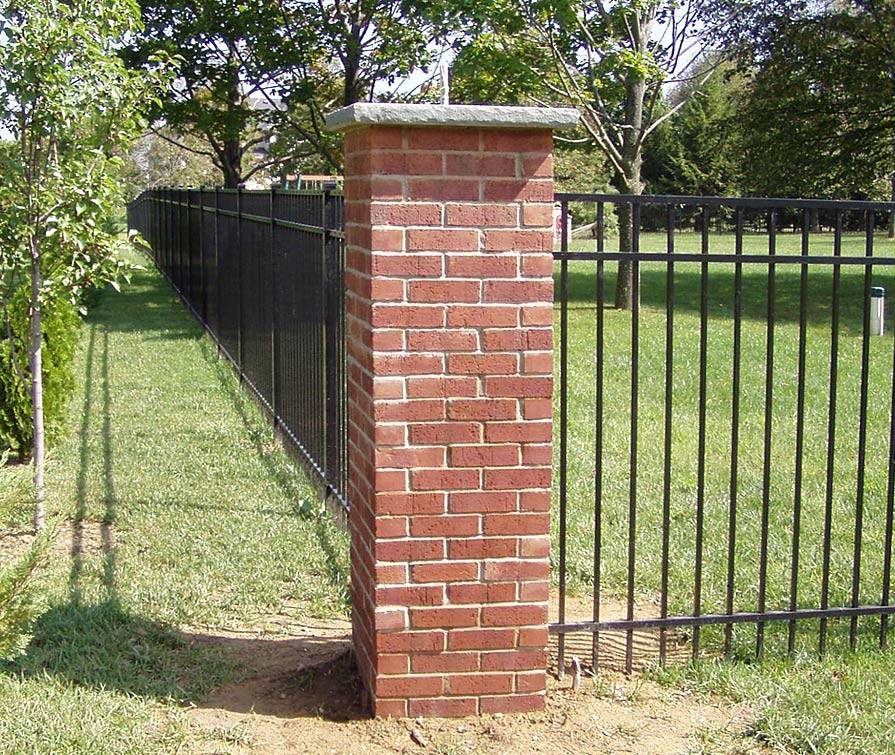 Изящные прутья кованой изгороди и ворот красиво сочетаются с кирпичными или каменными столбами.