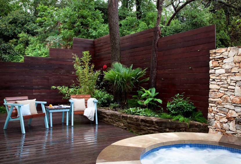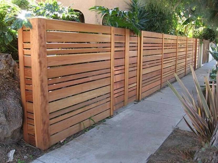 Из тонких деревянных реек можно создавать современные и удобные варианты заборов: вертикальные или горизонтальные жалюзи, плетенки, елочки. Удобнее всего собирать ограду из готовых секций, которые навешиваются на опорные столбы. Необходим ленточный фундамент: он не только правильно зафиксирует секции, но и убережет их от контакта с почвой.