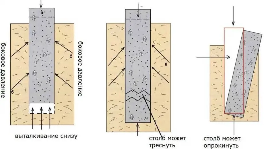 - при высоком уровне вод подземных или насыщении поверхностными ливневыми, талыми стоками глина неравномерно вспучивается, пытаясь вытолкнуть столб наверх при контакте с его уширенной подошвой;