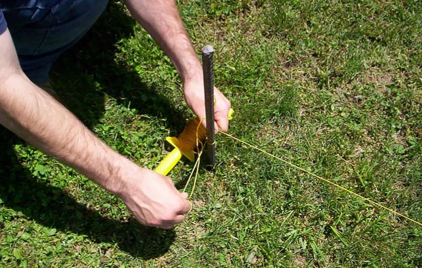 Натягиваем через разметку широкую крепкую нить, например, бечевку или нейлоновую. Помечаем места для ворот и калиток краской или другими заметными средствами. Можно и не использовать красочные вещества, если вы будете строить фундамент. Достаточно не протягивать нить на месте сооружений.