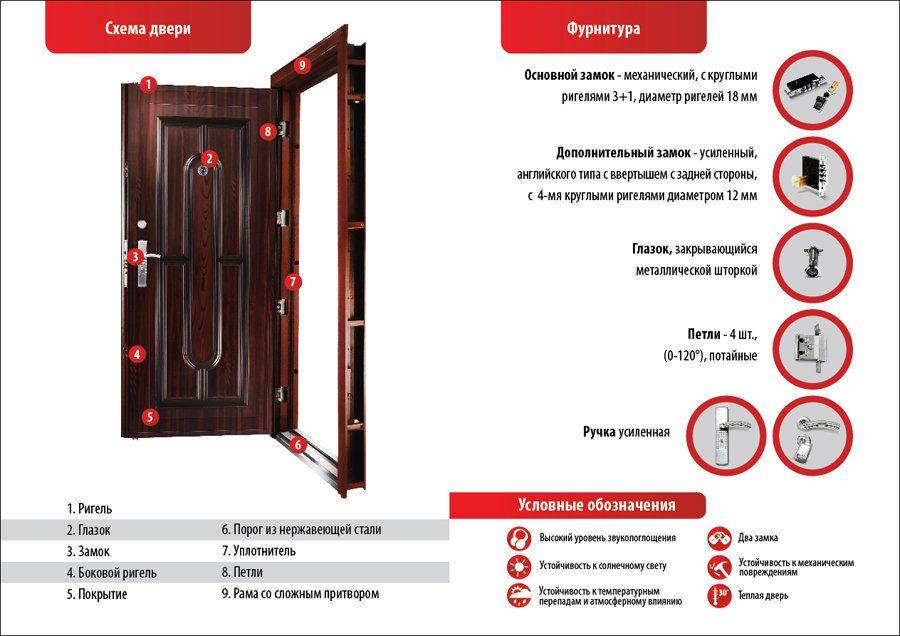 Чтобы подобрать качественную дверь, которая удовлетворит запросы хозяина, нужно внимательно ознакомиться со всеми ее характеристиками. Каждая имеет ряд параметров, которые влияют на внешний вид и эксплуатационные качества. Выделим основные свойства металлической двери.