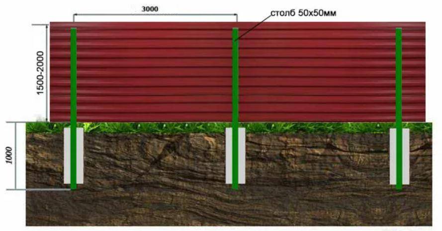Обязательно заливают цементным раствором, чтобы придать устойчивость. Расстояние между опорами зависит от размеров листов и составляет 1-5 м — чем меньше парусность, тем дальше опоры. Если не соблюдать эти требования, забор простоит недолго.