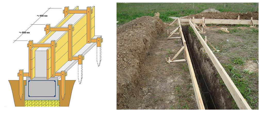 Конструкция опалубки выполняется на 3-5 см выше, чем планируется высота фундамента, так как бетонный раствор имеет свойство усадки. Она монтируется в предварительно подготовленный котлован, ширина которого на 15-20 см больше ширины опалубочной конструкции.