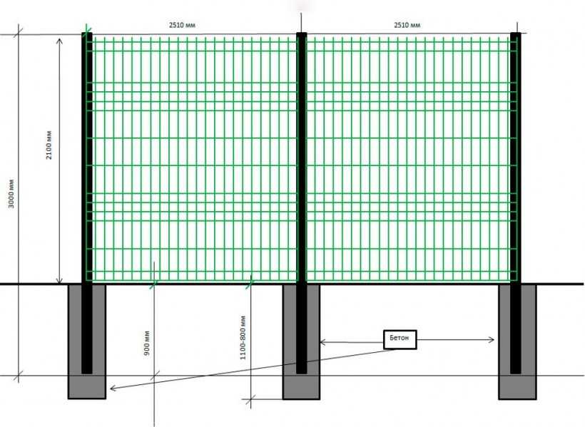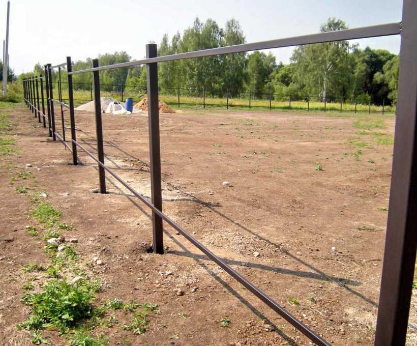 Для вертикальных стоек берут металлические трубы большого диаметра, бетонные, деревянные опоры. Крепят их более основательно, заглубляя на 70-100 см. Пролёты заполняют секционными изделиями, рабицей, др. нетяжёлыми элементами.