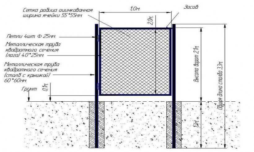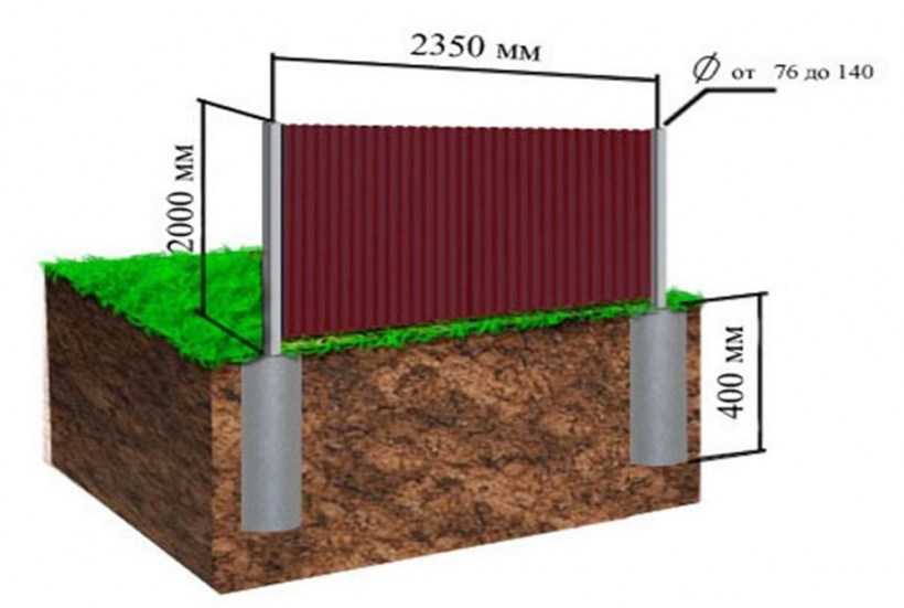 1Опоры для него должны быть достаточно прочными: стойкость к ветровой нагрузке у сплошных листов металла недостаточна. Обычно используют стандартные трубы 40х40х2 мм, которые углубляют в грунт на 30-40% своей длины.