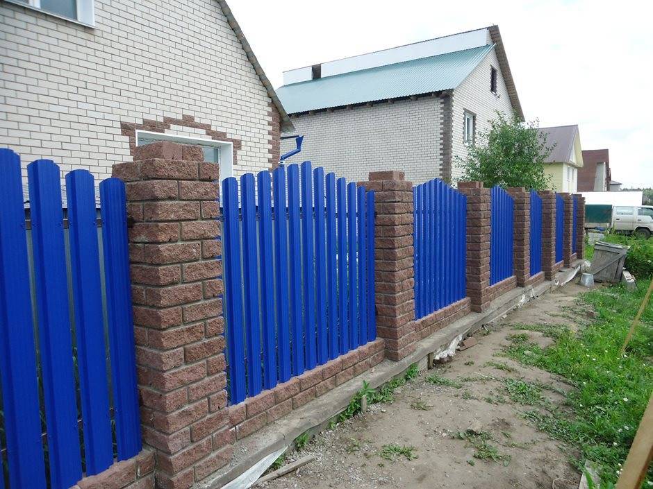 Обычно из кирпича сооружают столбы, фундамент и другие несущие конструкции. Профилированные листы, штакетник, металлические сварные или кованые конструкции используют для изготовления секций.
