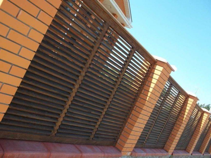 Эффектно смотрятся и ограждения, в которых комбинируют несколько материалов. Они гармонично сочетаются со зданиями, для отделки которых использовались разные способы. Например, цоколь из камня и оштукатуренный фасад или стены из кирпича с закрепленными снаружи деревянными ставнями.