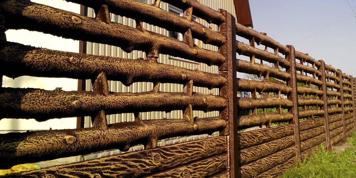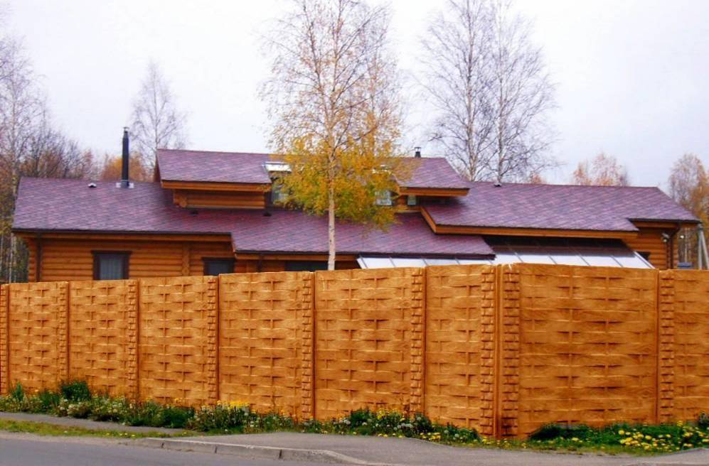 - Бетонные секции. Начинают приобретать свою популярность в России. Благодаря отливу раствора и последующей окраски на таких секциях появляются экзотичные узоры. Они помогут подчеркнуть оригинальность панорамы вокруг дома. По сравнению с металлическими кованными панелями стоит такой забор много дешевле.