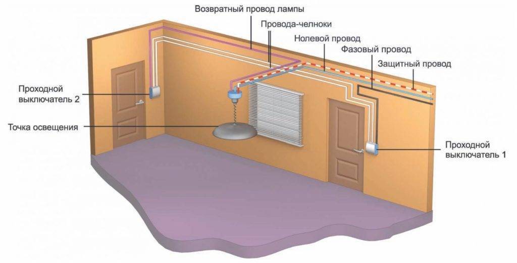 Проходной выключатель отличается от обычного количеством контактов. Если у обычного одноклавишного их 2, то у проходного 3 контакта. К одному подключается входящий провод, к другому — идущий к источнику света, третий идет к другому такому же выключателю. У двухклавишного выключателя 4 контакта.