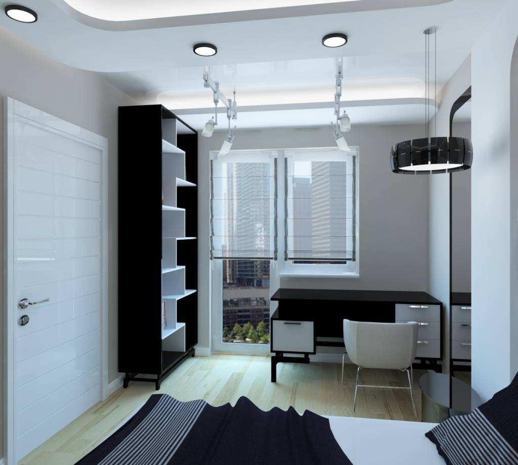 Дабы смягчить обилие все же мрачных тонов, необходим яркий акцент. И это опять же — обои аквамарин, допустим вид пастельных узоров даже на темной основе, главное чтобы они не сужали пространство. Также лампы, светильники, ковер, тоже более мягкой палитры.
