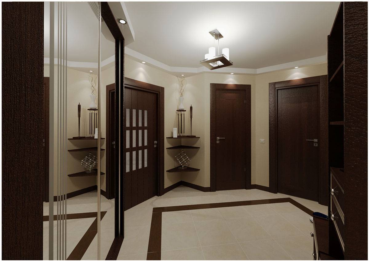 - Темные двери и примерно такого же оттенка пол прекрасно вписываются в интерьер прихожей или коридора. Здесь можно дополнить дизайн светлыми бежевыми стенами и мебелью темного оттенка.
