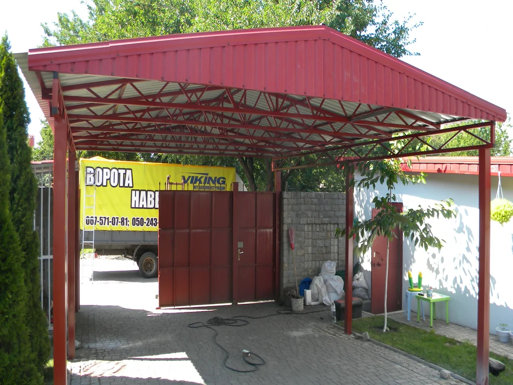 Наиболее часто основой производства таких конструкция становится уголок и швеллер, труба и профильная труба. Создать его можно из недорогих и облегченных материалов, под тент или ондулин, или придать конструкции жесткости и капитальности, если постройка возводится под шифер или металлочерепицу. Навесы из металла достаточно надежны, а потому, потратившись на подобную постройку один раз, вы сможете долгое время только подкрашивать ее и обновлять некоторые части.