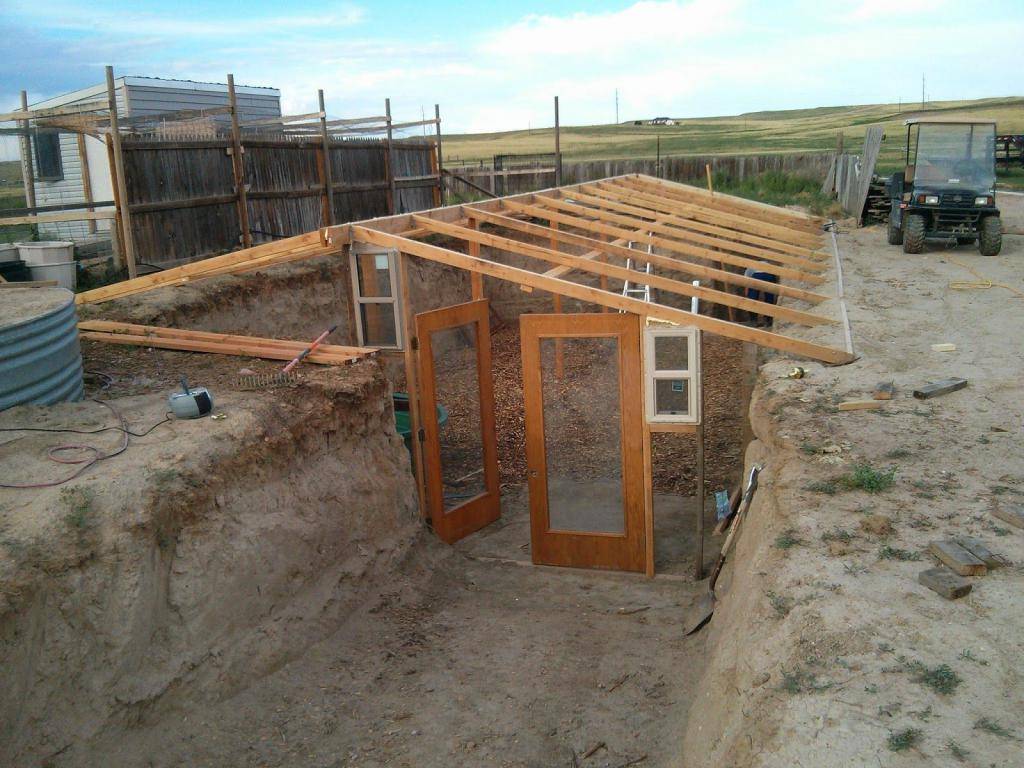 Конструктивно большая часть термосной теплицы расположена под землей. Поэтому сперва необходимо вырыть котлован. Размеры выбирают исходя из своих потребностей, но глубина должна быть не менее 2 м, а ширина не более 5 м. Стенки котлована стараются сделать как можно ровнее, поскольку к ним будут вплотную возводиться стены самой тепличной конструкции.