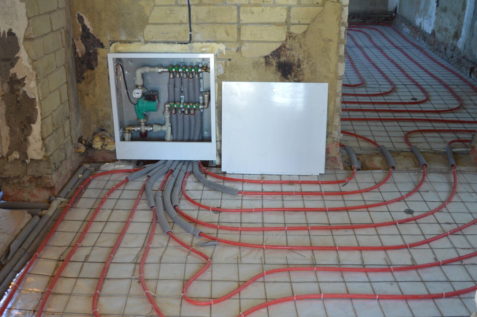 Затем устройство подключается к электрическому питанию, и осуществляется его тестирование. Если все работает в нормальном режиме, то можно заливать стяжку.