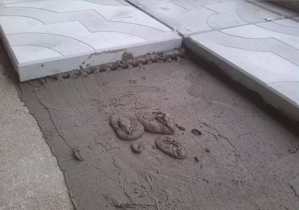 Процесс укладки такой же, как и при монтаже на песчаную основу, только в этом варианте используется не сухая смесь, а цементно-песчаный раствор, который выступает в роли плиточного клея. Раствор наносят на бетонное основание толщиной 2-3 см и укладывают плитку.