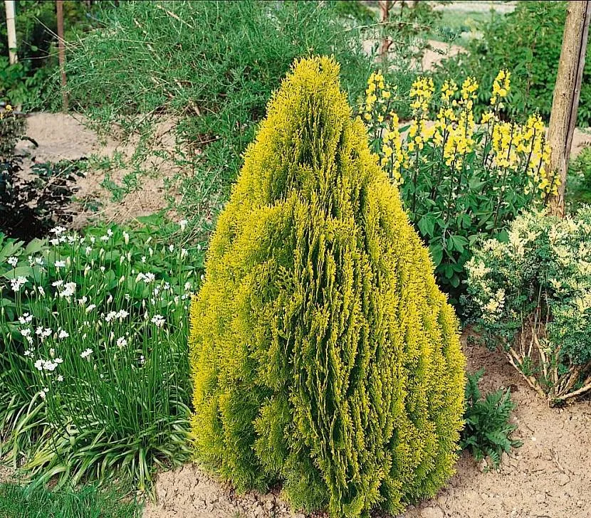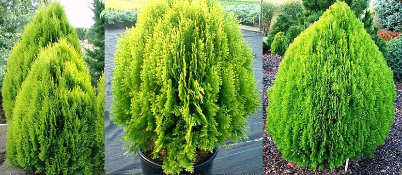 шаровидные — (Глобоза, Даника) — медленно растут равномерно во все стороны, образуя крону в виде шара даже при минимальном уходе и обрезке, часто высаживаются группами, используются в миксбордерах, альпийских горках и на клумбах.