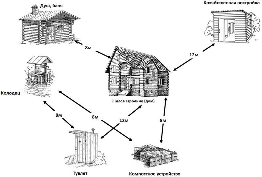 - От жилых зданий и других построек на участке выполняется отступ не менее 8 м.