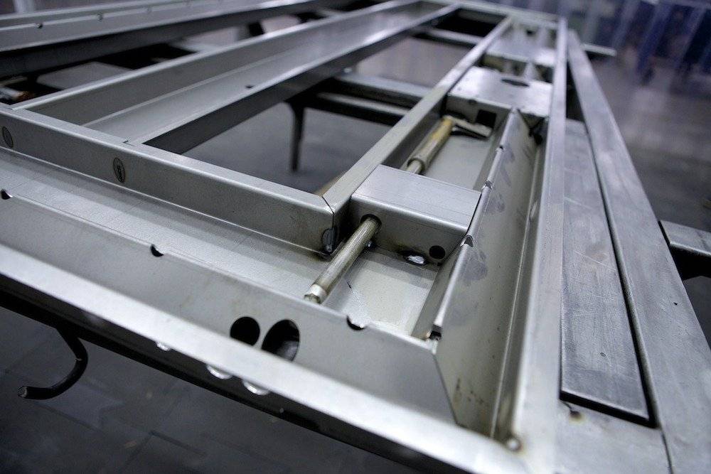 Надежность обеспечивается наличием внутренних ребер, созданных для повышения жесткости всей конструкции. На основание привариваются металлические листы, которые надежно скрепляют все части, делая полотно очень прочным.