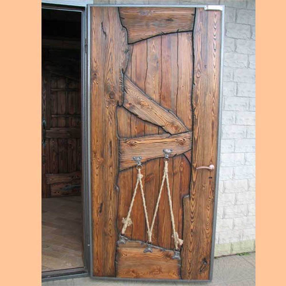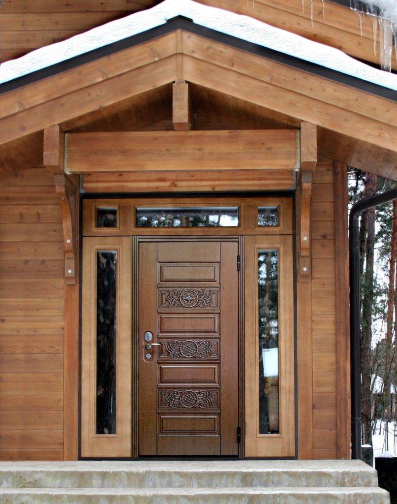- массив дерева – это красиво и дорого. Выбирая определенную породу дерева и способ его обработки (окрашивание или лакировка, резьба), можно получить желаемый внешний вид полотна. Дерево обладает отличными тепло- и звукоизоляционными качествами. Минус – на поверхности легко оставить царапину, к тому же, дерево боится перепадов температур и влажности. Чтобы отделка была долговечной, придется регулярно обрабатывать древесину защитными средствами. Если дверь выходит на улицу, то обработку придется проводить чаще, причем лучше, чтобы была дополнительная защита в виде козырька над входом в дом;