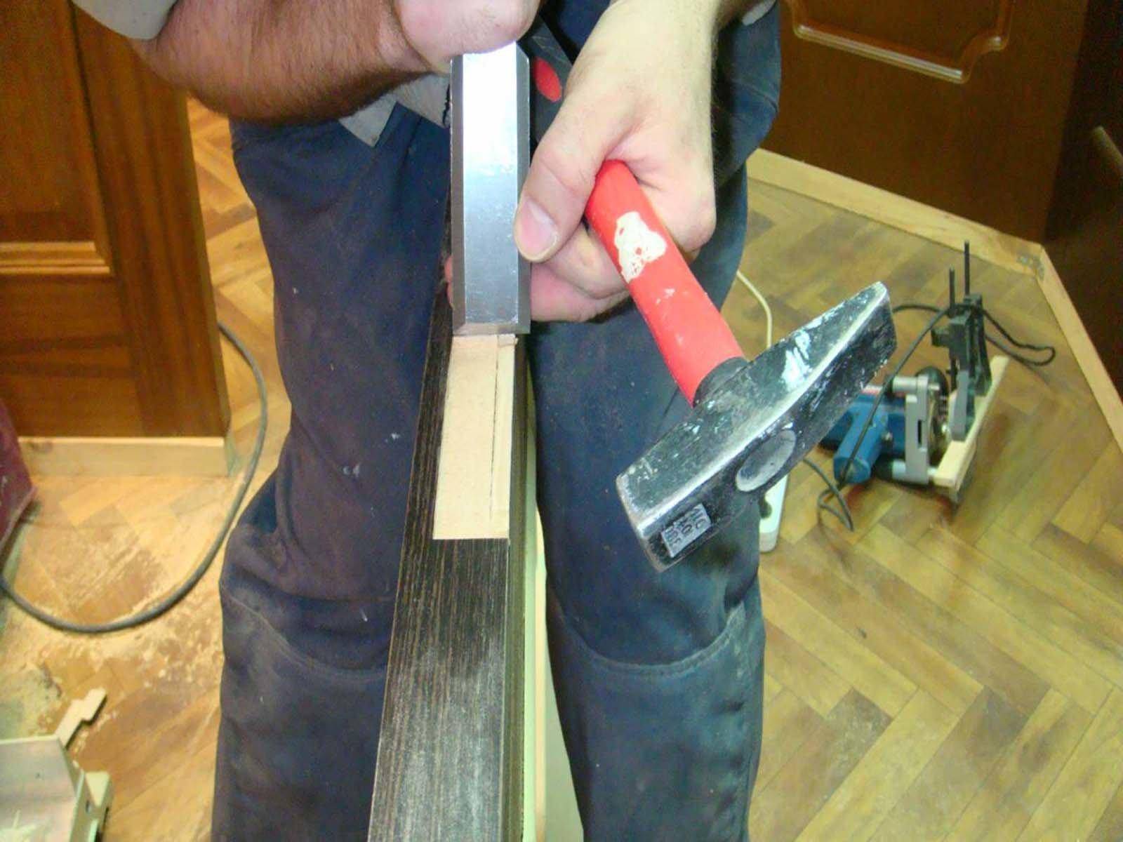 Второй способ сборки стоек встык – простой и надежный! Соединяем притолоку со стойкой под углом 90 градусов. На стыке двух планок будет небольшой выступ, который аккуратно удалить. Для этого лучше всего использовать стамеску.