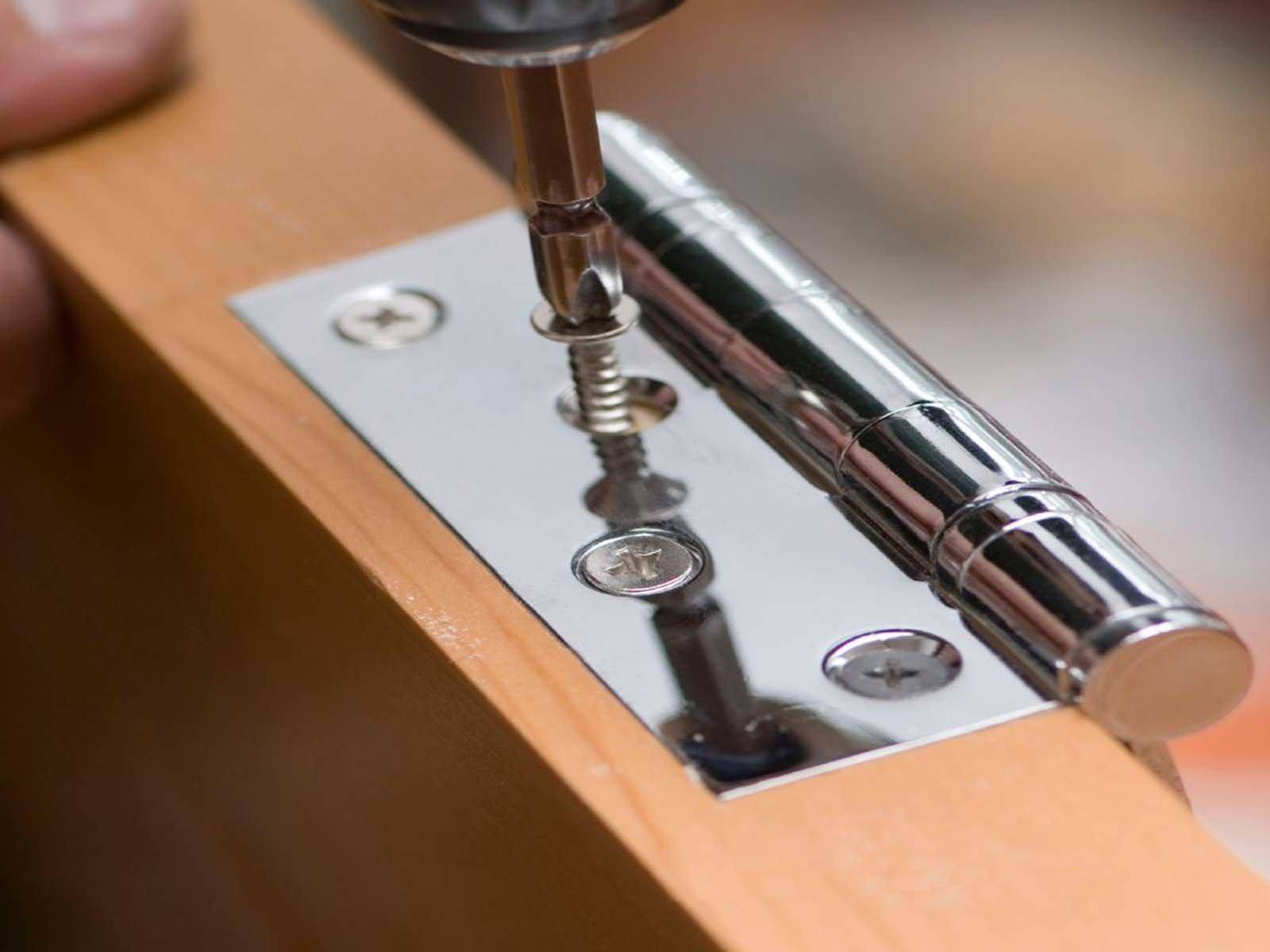 ШАГ 3: установка петель. Берем заранее подготовленные саморезы нужной длинны, шуруповерт или отвертку, и производим крепление петель на полотне двери.