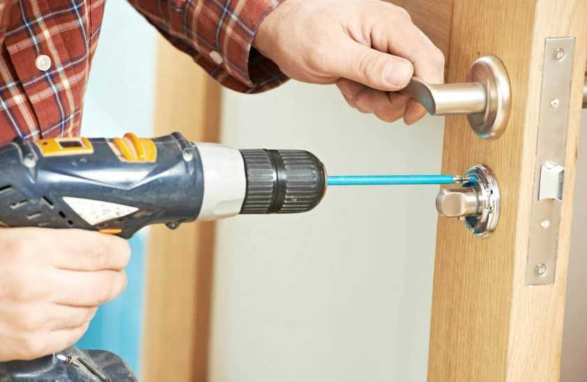 - затем в торцевой части двери необходимо просверлить отверстие под защёлку, оно должно располагаться строго посередине основного отверстия под замок, просверлённого ранее;