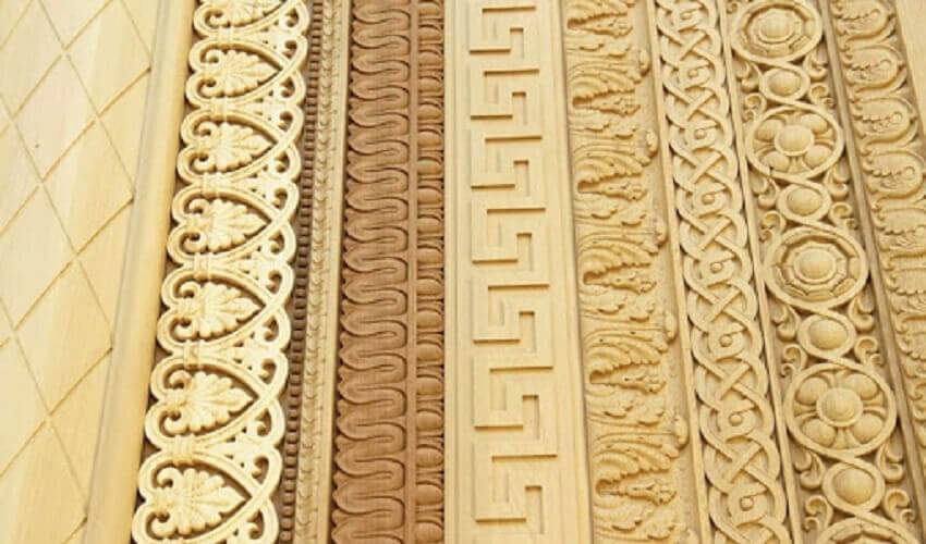 - фактуре: простые планки, резные обрамления, выполненные по шаблонам;