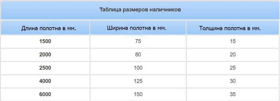 Нам известно, что высота дверной коробки — 2050 мм. Длина полотна наличников — от 1500 мм.(См таблицу).