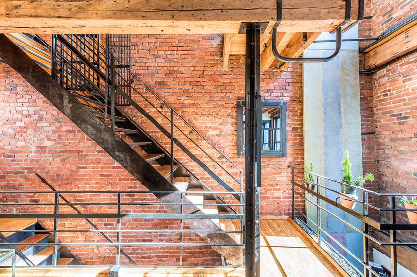 - Современный стиль лофт подразумевает минимализм. Никакой лишней мебели, никакого излишнего украшательства. Простой пример: стены покрашены в белый цвет, в то время как лестница с этажа на этаж оформлена перилами со стеклянными экранами и металлическими коваными элементами. В данной стилистике рисунок кованых элементов должен быть простым, состоящим из прямых элементов.
